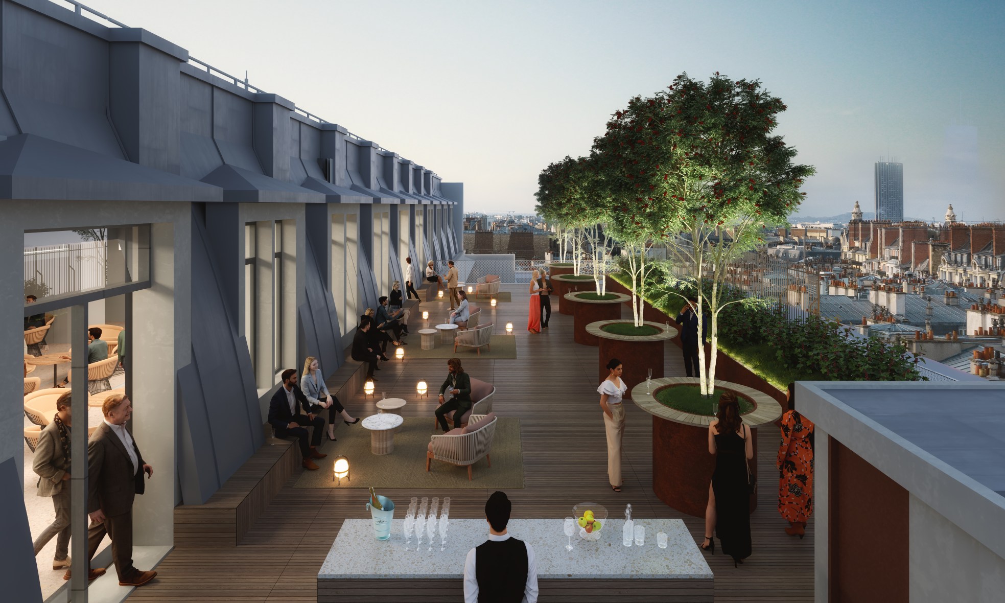 of landscaped rooftop space with exceptional views over the rooftops of Paris, from Sacré-Cœur to the Eiffel Tower