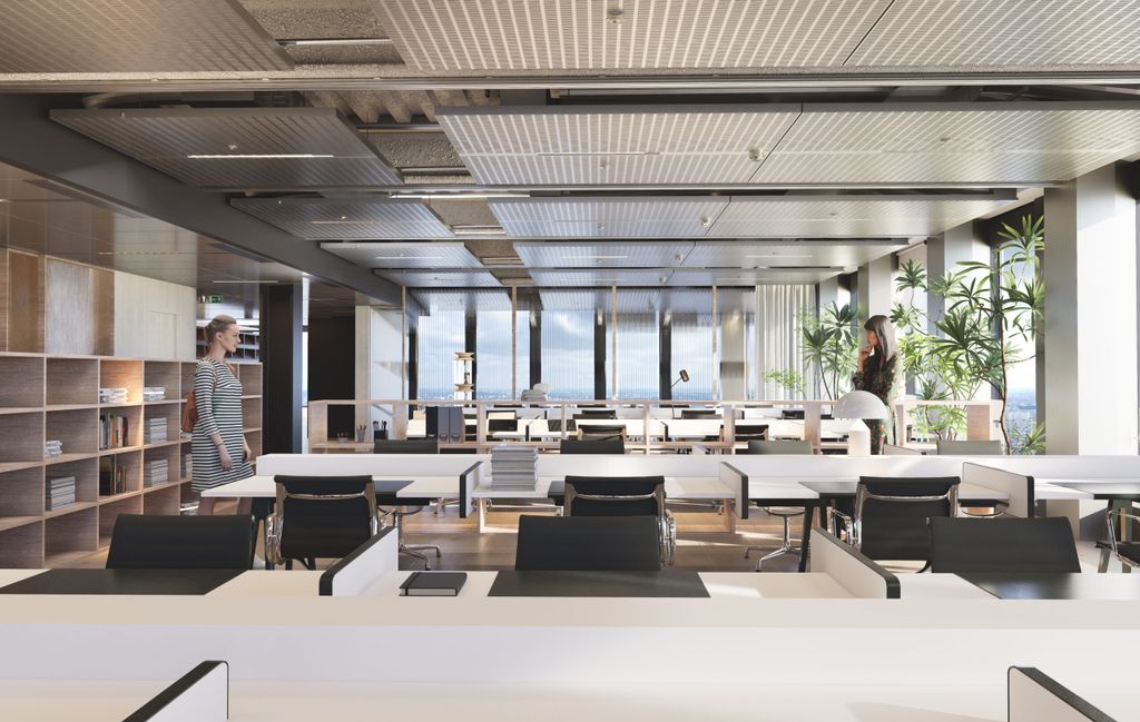 Supérieure : Un plateau sur mesure aux vues panoramiques exceptionnelles au service d’un open space rénové, prêt à être réaménagé, avec le souci du réemploi maximal des équipements existants.